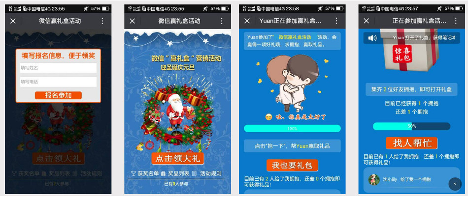 用户报名参加赢礼盒活动,然后邀请好友帮忙打开礼盒,达到礼盒打开人数要求,用户可以打开礼盒获得奖品;如果用户打开的是空礼盒,用户可以再次发起分享邀请,再次活动打开礼盒的机会 (后台可以设置用户有多少次重头再来的机会)